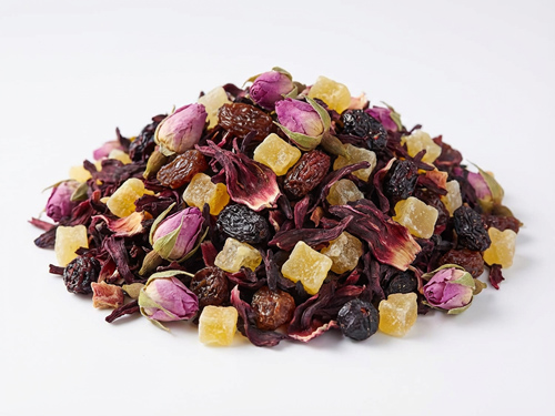 Deze geslaagde compositie van sappige, zoete, smaakvolle kers en heerlijke, rijpe, onopvallende banaan is zowel warm als koud een waar genot. De bananenschijfjes en roze rozenknoppen komen prachtig tot hun recht op een bodem van ananasblokjes, een beetje hibiscus en wat rozijnen.