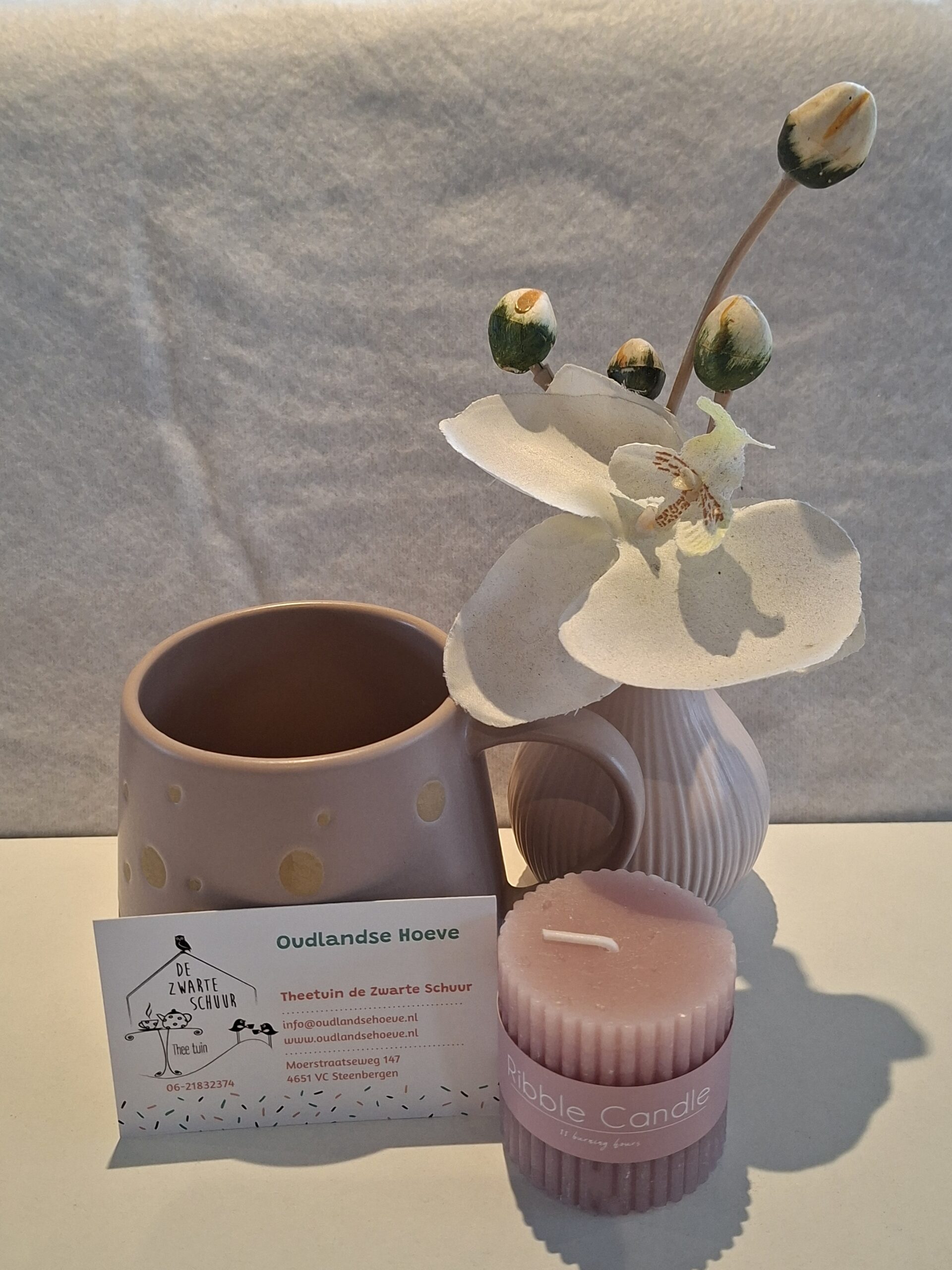 Onze beker uit onze collectie ‘Christiaan’, die nu in de aanbieding is, hebben wij in deze geschenkset gecombineerd met een bijpassend vaasje met kunstorchidee en een kaarsje.