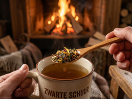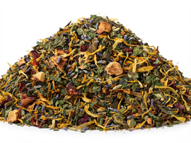 Een theegenot dat niet alleen ‘s avonds gemakkelijk voor rust en kalmte kan zorgen. Achterover leunen, van het moment genieten en misschien even de ogen sluiten. Optisch springen de felgele goudsbloemen en blauwe lavendelbloemen charmant in het oog. Bramenbladeren, appelstukjes en venkel geven deze mix een heerlijk milde, zachte smaak met een lichte zoetheid. Komijn voegt een vleugje kruidigheid toe, terwijl citroenmelissebladeren een aangename frisheid bieden. De lichte bloemige noot van lavendelbladeren blijft aangenaam in de mond. Een wereld van genot die schittert zonder toevoeging van aroma’s.