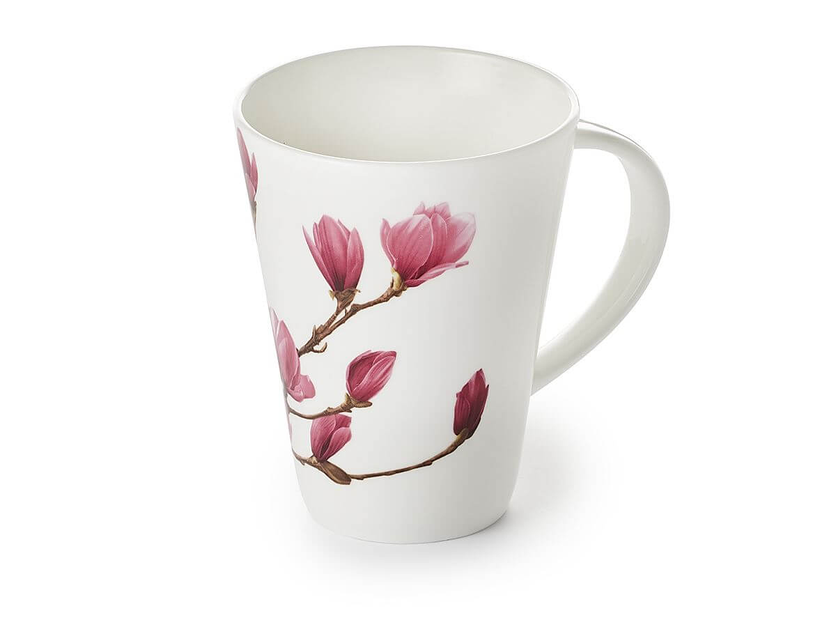 Dit prachtige decor is voorzien van een tak van de prachtige paarse magnolia. Met een gemiddelde inhoud van 0,3 l is het artikel geschikt om te genieten van verschillende, exquise theespecialiteiten of de mixkoffie van uw keuze. Het hoogwaardige Fine Bone China-materiaal maakt de mok gemakkelijk vast te houden en geeft hem een bijzonder exclusief tintje.