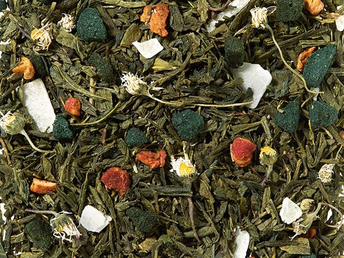 Fris, pittig en licht harmoniëren de typische aloë vera-tonen met de smaak van appel en een vleugje citrus. De mosgroene appel, spirulina crunchy en de gedroogde madeliefjes smelten prachtig samen met de groene theemelange. Helderwitte stukjes aloë vera maken het plaatje compleet.